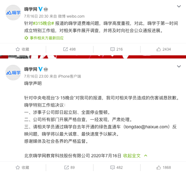 以嗨学网为例,央视315晚会说收到上百封投诉信。它的危机公关策略就是:1、不管报道我啥负面,我都先回一条,这条可以适用于任何负面;2、针对具体曝光内容,给出一个阶段性决策和行动。