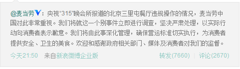 老一点的公关人,或者公关新人在外面上课时,都会记得一个案例,那就是2012年,央视315晚会曝光三里屯麦当劳店存在食品安全问题时,麦当劳当时危机公关不到1个小时的快速响应。
