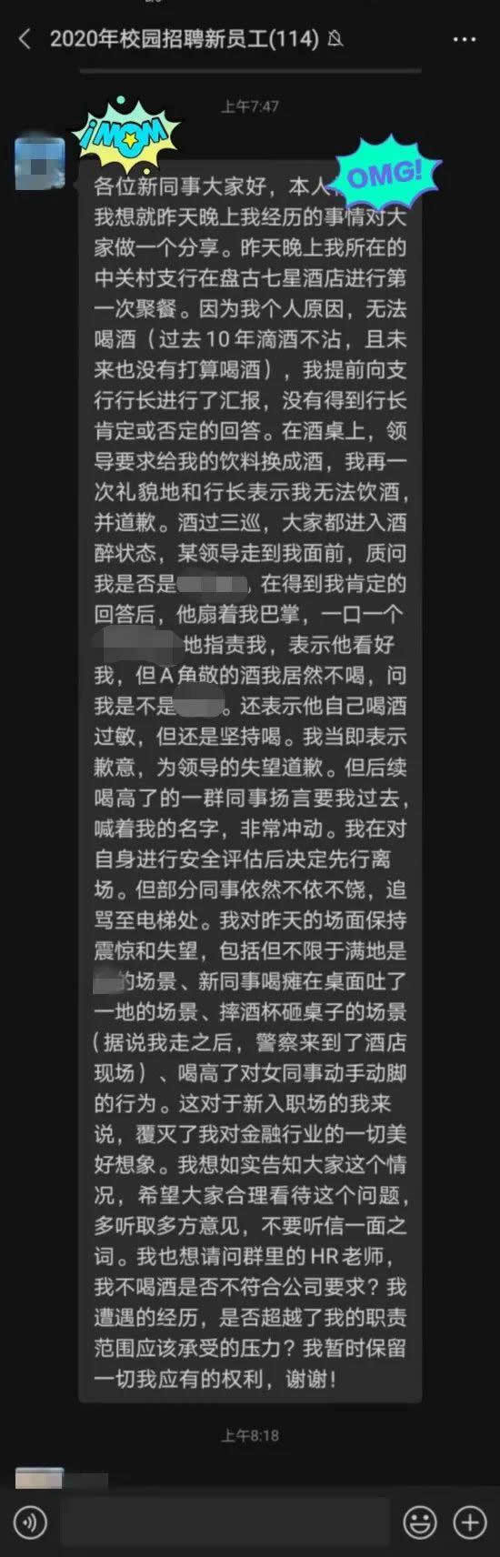 近来,某银行员工拒喝领导敬酒而被辱骂扇耳光的事件闹得沸沸扬扬,从微信群中的一段