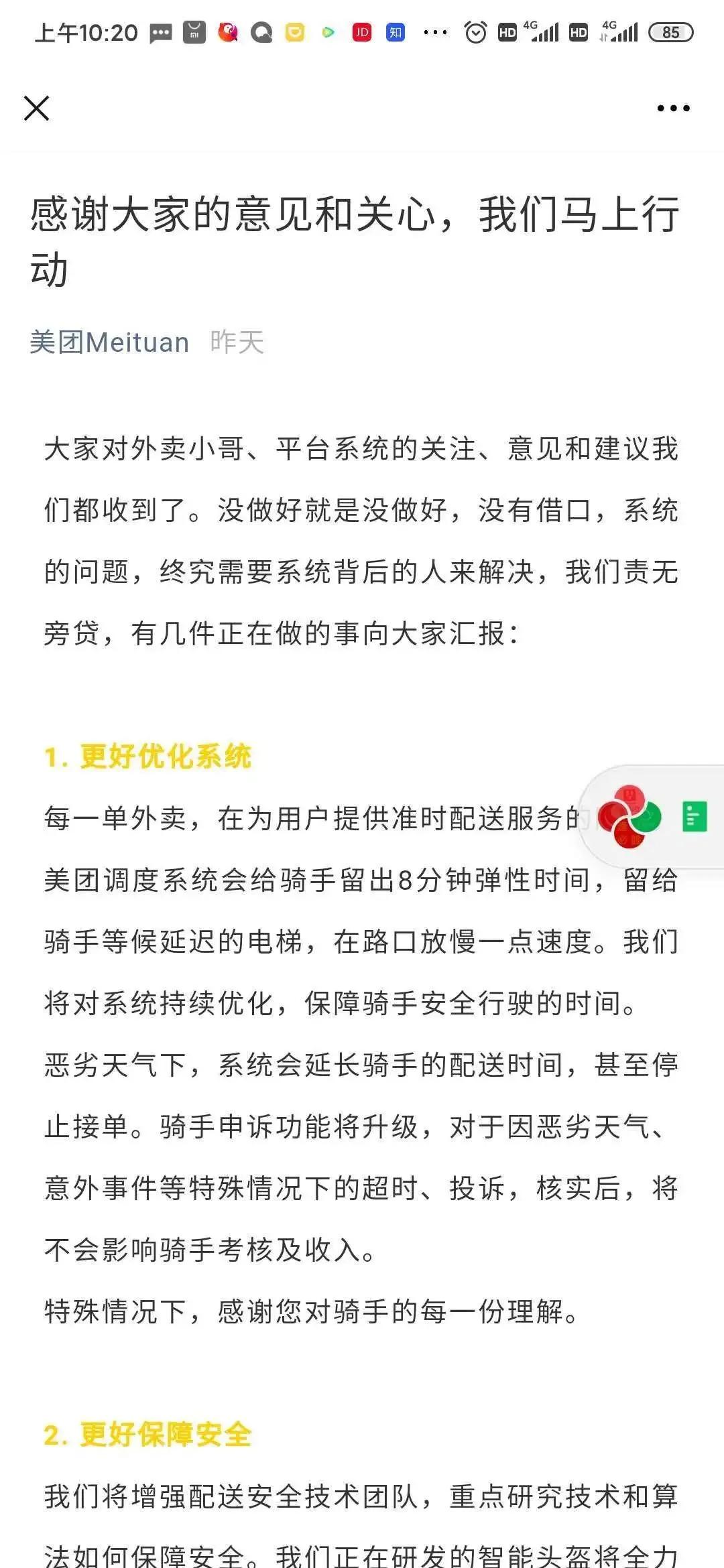 而看了网友反应的美团的回应就显得高明的多,第一条改进措施就是“更好的优化系统”,没用转嫁平台与骑手、消费者的矛盾。