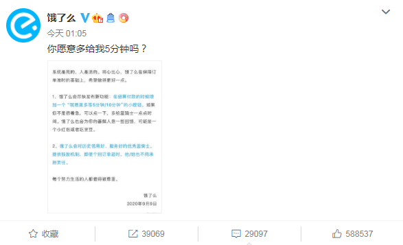 如此巨量的负面新闻,两大平台自然坐不住,随后饿了么9日凌晨1点就发布了一份“你愿意多给我5分钟吗?”的回应。