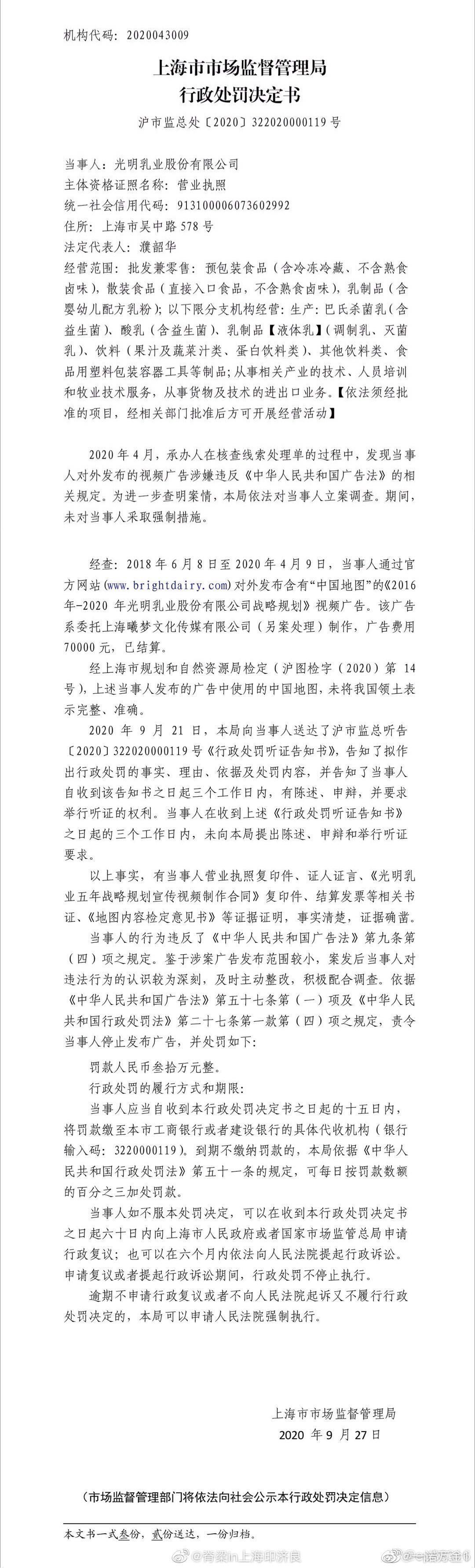 广告或泄露国家机密?光明乳业被上海市市场监督管理局罚款30.0000万元。
