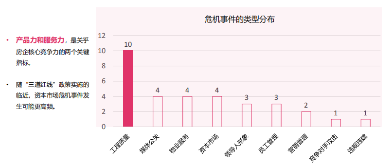 此外,从危机事件的类型分布统计中可以看出,工程质量和物业服务在32个危机事件中占了14个,接近一半,“产品力和服务力,依然是关乎房企核心竞争力的两个关键指标,因而,也备受媒体和消费者的关注。”