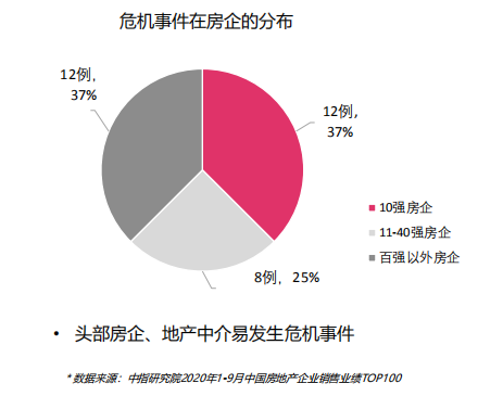 根据中指院从2018年8月到2020年9月统计数据,前40强房企发生的危机事件占到了全行业危机事件数量的一半以上,印红表示,“随着企业体量的增加,受关注度的增加,头部房企吸引到的炮火也越来越多。”