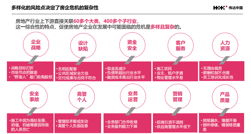 而且,由于房地产行业上下游直接关联60多个大类、400多个子行业,这一综合性的特点,促使房地产企业在发展中,可能面临的危机是多样且复杂的。