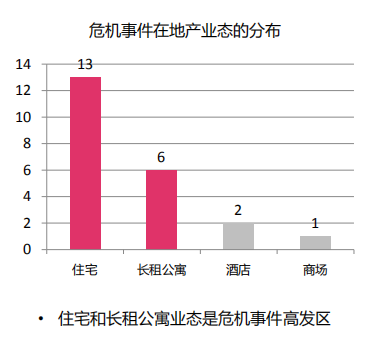 而危机事件在地产业态的分布上,住宅业态有13次,长租公寓业态6次,酒店和商场总共仅3次,“这两个涉及民生问题比较多的业态,是危机事件的高发区。”印红说。
