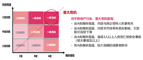 其中,前两个因素或比较模糊。就此,印红进一步作出了解释:“一般可根据媒体的级别,来划分危机的等级。A类媒体的报道对公司产生较大影响的,便被定为一级危机。媒体的重量级别以及媒体报道的猛烈程度,是决定危机是否会被发酵的重要因素。”