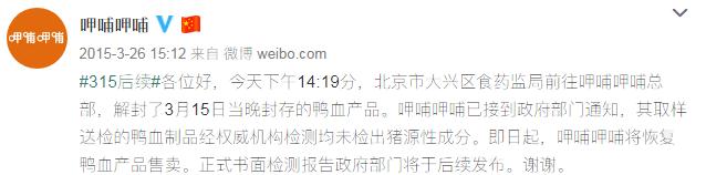 在呷哺呷哺鸭血事件,官方检测为呷哺呷哺带来了好消息。3月26日,呷哺呷哺官方微博发布消息:“今天下午14:19分,北京市大兴区食药监局前往呷哺呷哺总部,解封了3月15日当晚封存的鸭血产品。呷哺呷哺已接到政府部门通知,其取样送检的鸭血制品经权威机构检测均未检出猪源性成分。即日起,呷哺呷哺将恢复鸭血产品售卖。正式书面检测报告政府部门将于后续发布。”