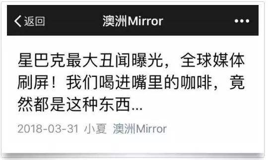 2018年3月29日,一个名为“澳洲Mirror”的公众号撰写了一篇文章:《星巴克最大丑闻曝光,全球媒体刷屏!我们喝进嘴里的咖啡,竟然都是这种东西......》。文章中作者宣传“喝星巴克咖啡致癌,是被隐瞒了8年的真相......”、“美国洛杉矶法院的一纸裁定,可以说是直接判了星巴克的死刑”等等对星巴克不利的内容。