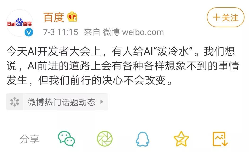 百度微博当事发时立刻在微博上做出回应,“今天AI开发者大会上,有人给AI“泼冷水”。我们想说,AI前进的道路上会有各种各样想象不到的事情发生,但我们前行的决心不会改变。 ”