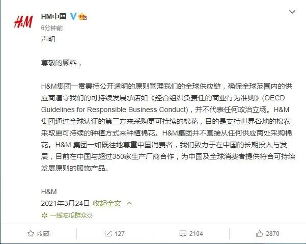 此后不久,据@央视网 微博消息,H&M集团在网站发布的一份声明引发关注。这份声明写道:H&M集团对来自民间社会组织的报告和媒体的报道深表关注,其中包括对新疆维吾尔自治区少数民族强迫劳动和宗教歧视的指控。声明中,H&M集团表示,我们不与位于新疆的任何服装制造工厂合作,也不从该地区采购产品/原材料。