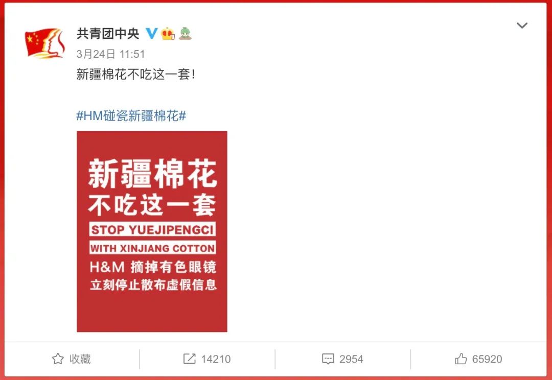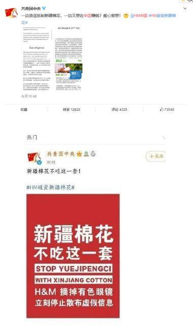今天,@共青团中央 微博发布的两条有关H&M公司#碰瓷新疆棉花#的消息引发网友广泛关注。