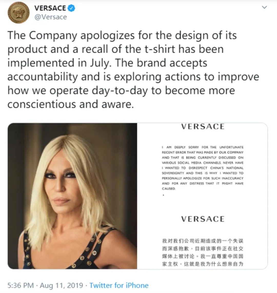舆论发酵,网上一片抵制声,而Versace范思哲紧急致歉,之后还应网友强烈要求,在外网以及几大社交媒体同步以中英文形式公开道歉。