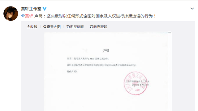 黄轩工作室声明称,“我司艺人黄轩与H&M品牌已无合作。黄轩及团队坚决反对任何形式企图对国家及人权进行抹黑造谣的行为!特此声明!”