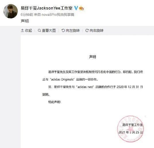 傍晚,易烊千玺工作室发声明宣布@TFBOYS-易烊千玺 及工作室坚决抵制任何污名化中国的行为,即日起,终止与阿迪达斯品牌的一切合作。
