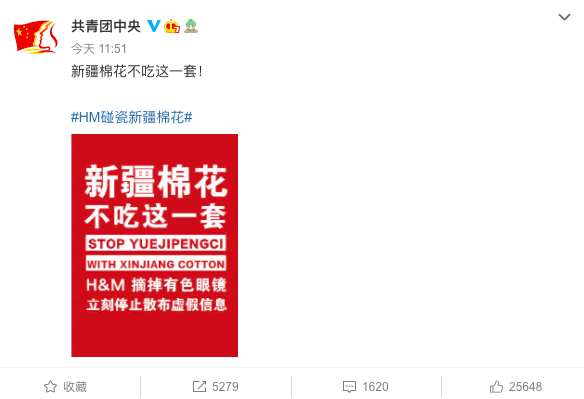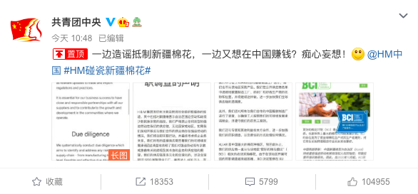 @共青团中央 也关注到此事,并连发几条微博,“一边造谣抵制新疆棉花,一边又想在中国赚钱,痴心妄想!”