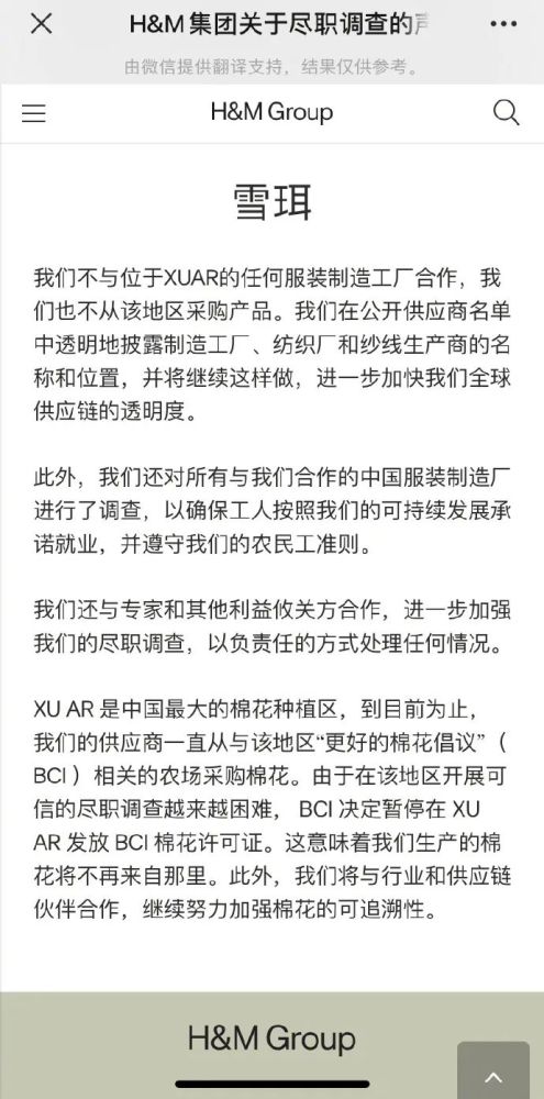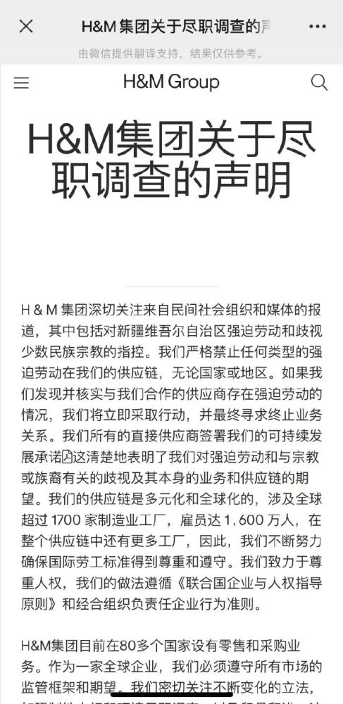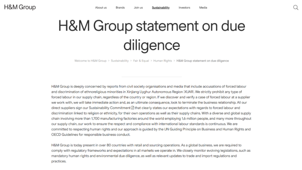 H&M集团,在网站发布的一份声明《H&M Group statement on due diligence》引发关注。