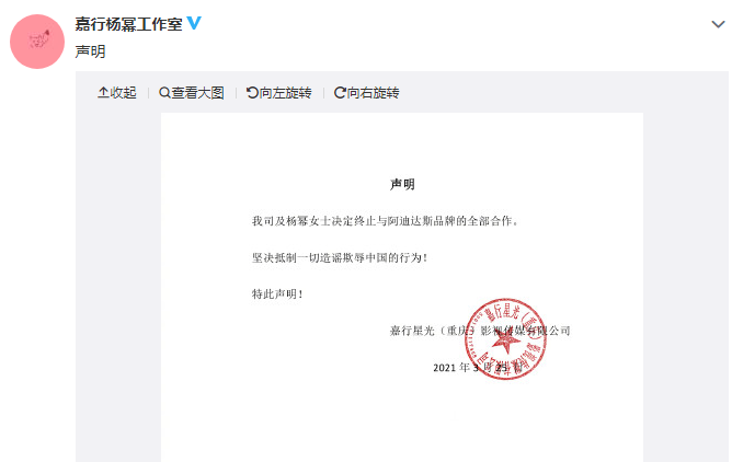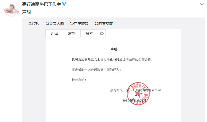 杨幂、迪丽热巴工作室也发布声明,宣布终止与阿迪达斯的合作。