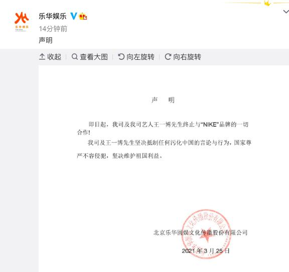 在众多网友的催促与批评之下,3月25日,乐华娱乐发文宣布王一博终止与耐克品牌一切合作,并严正声明:“我司及王一博先生坚决抵制任何污化中国的言论与行为,国家尊严不容侵犯,坚决维护祖国利益。”