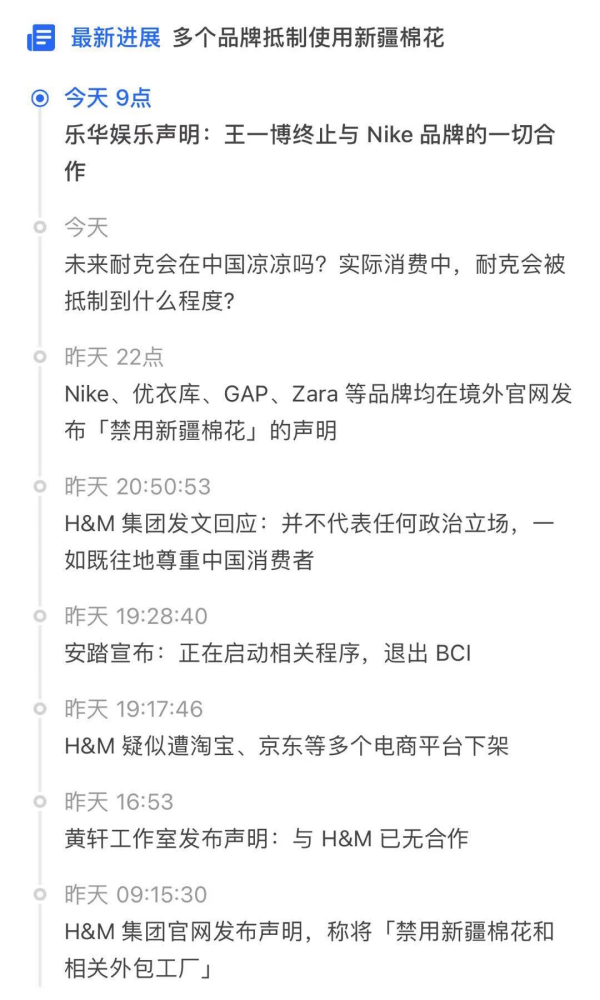 截至本文今日中午撰稿时,H&M抵制新疆棉花事件,大致如下图