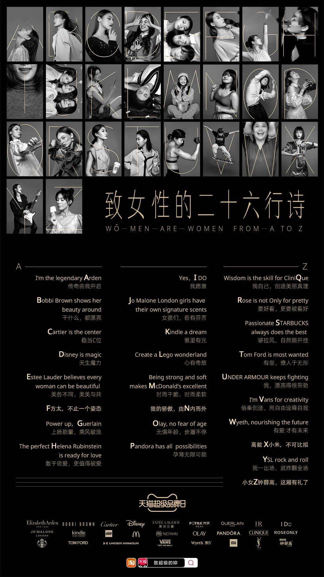 分享我认为做得很好的案例:这个3.8女神节,天猫超级品牌日联合从A到Z的26个超级大牌,献上一首《致女性的二十六行诗》——致敬女性的平凡和伟大。
