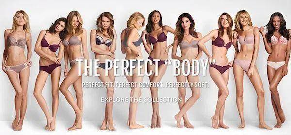 再对比2014年维密广告惹群怒的事件,2014年维密为了给大秀造势,发布了一则站着1平面海报,广告语写着“完美身材”,模特儿也是一水的大胸、细腰、大长腿,黄金比例。