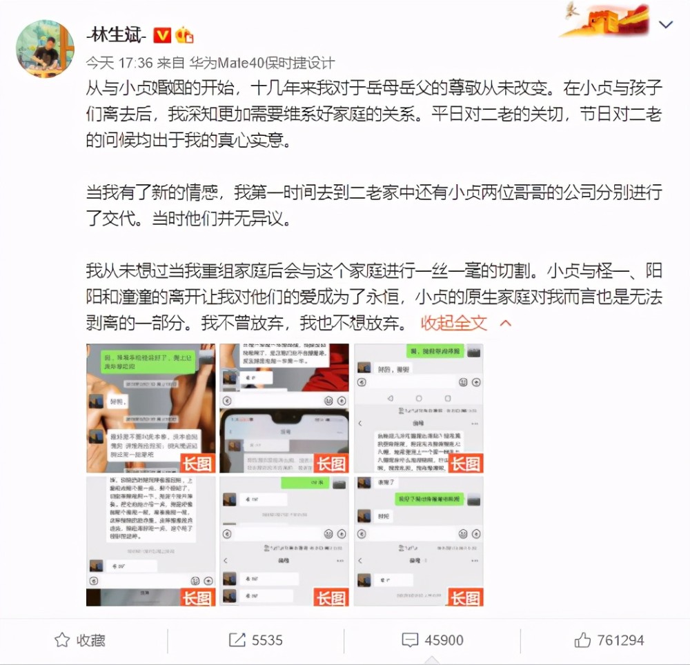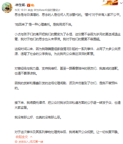 林生斌继续强调自己对前妻及孩子的爱,是永恒的。并且终于提及了,自己对于隐瞒重组家庭造成的社会影响,而表达了歉意。