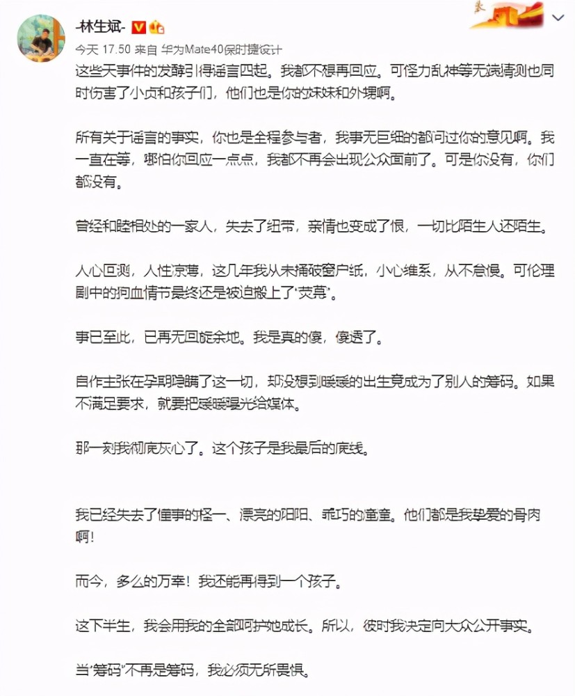 而且,林生斌此时的五篇长文,对于舆论也无济于事。如果真的爱现在的妻子和孩子,还不如消失于闹市,过好自己的平静生活,何苦还要扳回大众舆论这一局。