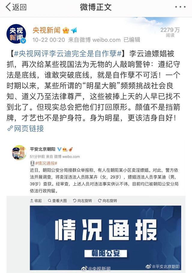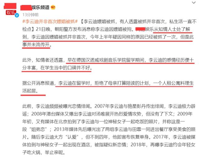 10月21日,被美誉“钢琴王子”的李云迪突然“塌房”,北京平安朝阳通报李云迪涉嫌嫖娼案件,对方是一名29岁的女子,李云迪对嫖娼违法一事供认不讳,已被正式拘留。