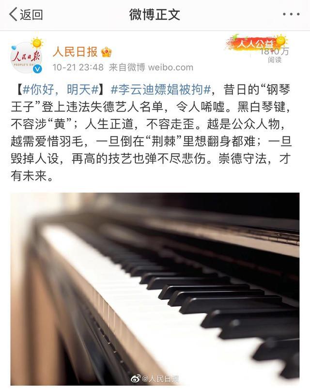 10月21日晚,“钢琴家李云迪因嫖娼被拘”的通报引爆了舆论场。