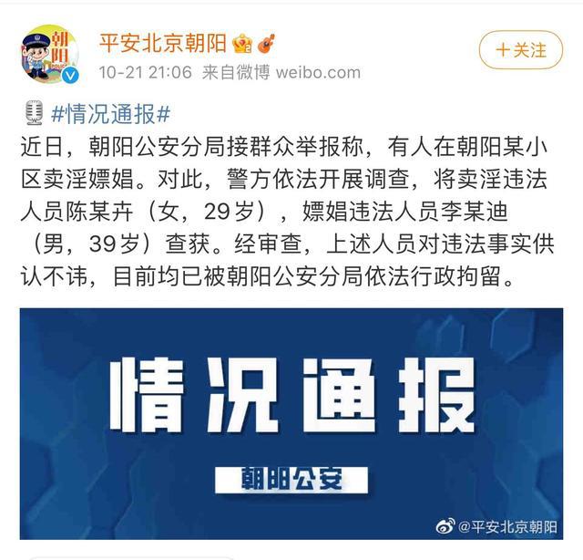 根据北京市朝阳公安分局发布的通报,近日,接群众举报称,有人在朝阳某小区卖淫嫖娼。对此,警方依法开展调查,将卖淫违法人员陈某卉(女,29岁),嫖娼违法人员李某迪(男,39岁)查获。经审查,上述人员对违法事实供认不讳,目前均已被朝阳公安分局依法行政拘留。