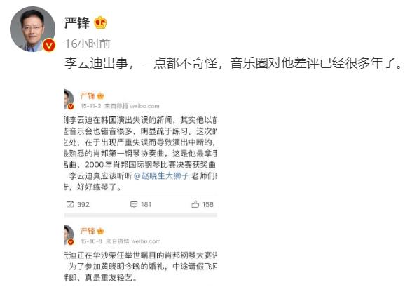 据悉,拥有五百多万粉丝的复旦大学中文系严锋教授在李云迪出事后,曾站出来发声,他转发了自己曾在2015年就发表过的看法,直言:“李云迪出事,其实一点都不意外,音乐圈对他差评已经很多年了。”