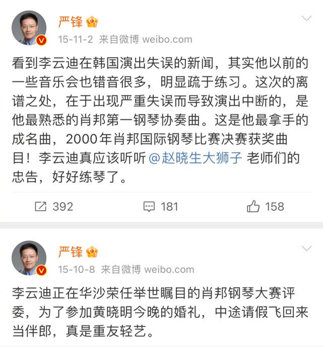 从严锋教授转发的动态中得知,他在15年时,曾两次批评过李云迪生活作风有问题,在比赛时,因为要参加黄晓明的婚礼,李云迪中途请假飞回来当伴郎,无视评委职责,是严重失德。另外,严锋还指出李云迪此前在专业上就多次犯过明显的错误而导致演出中断,还直言他该认真听听老师们的忠告,好好练琴了。