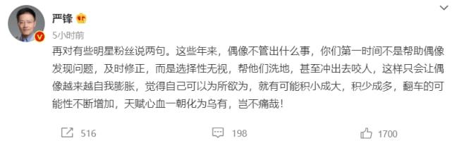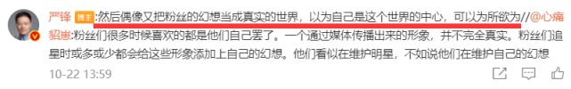 或许是遭受到李云迪粉丝的围攻,严锋教授更是劝解粉丝不要选择无视帮着洗地,甚至冲出去咬人,这样只会让偶像越来越膨胀,觉得自己可以为所欲为,就有可能积小成大,积少成多,翻车的可能性不断增加,甚至让偶像以为自己是这个世界的中心,把粉丝和幻想当成真实的世界。