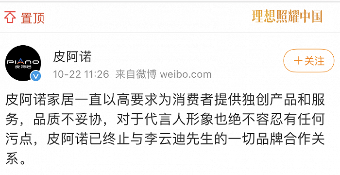 可以想见,在当前对劣迹艺人趋严的舆论环境下,李云迪现有的商业合作未来将悉数取消。22日中午,皮阿诺官方微博发布消息称,“皮阿诺家居一直以高要求为消费者提供独创产品和服务,品质不妥协,对于代言人形象也绝不容忍有任何污点,皮阿诺已终止与李云迪先生的一切品牌合作关系。 ”在今年年初,皮阿诺才签约李云迪,聘任其为公司代言人。