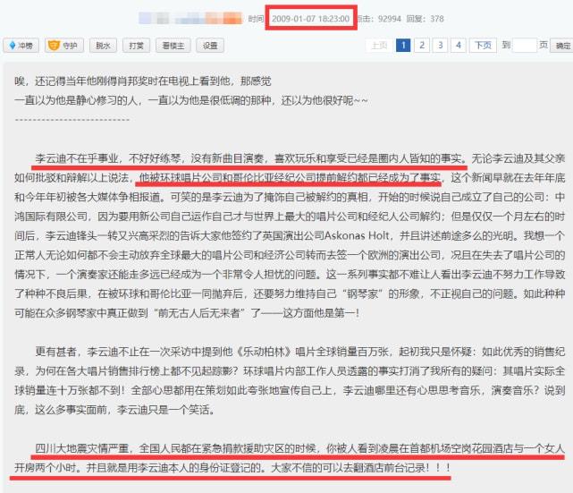 而在2009年时,李云迪就被网友深扒起底,吐槽他不在乎事业,不好好练琴,没有新曲目演奏,喜欢玩乐和享受已是圈内人皆知的事实,另外,还爆料李云迪在灾情时,被人看到在首都机场附近酒店与女人一起两个小时,而当时用的就是李云迪本人的真实身份。