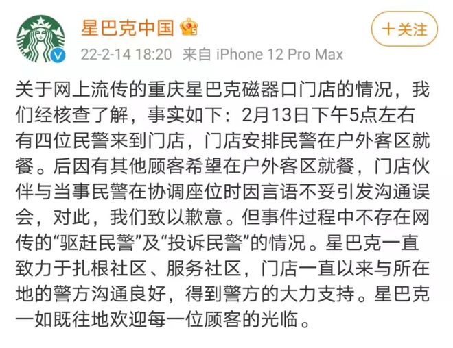 2月14日,星巴克中国发布了一份稍显草率和不正式的致歉声明,表示:“其他顾客希望在户外客区就餐,因协调座位时言语不妥引发沟通误会”,致以歉意,澄清不存在“驱赶民警”和“投诉民警”的情况。