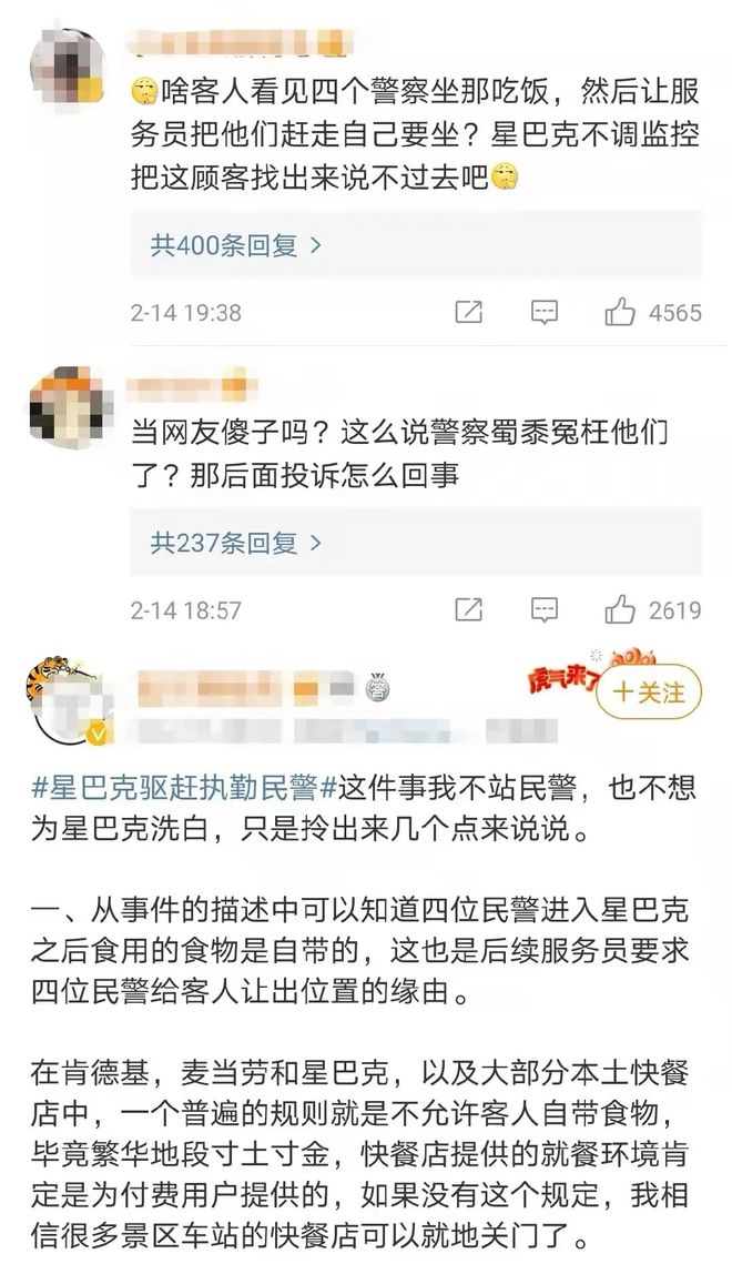 2月13日,有网友发帖称:重庆一星巴克赶走在门口吃盒饭的四位民警,认为民警“会影响品牌形象”,事后还恶意投诉。