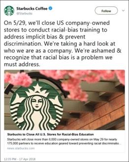 这不是第一次星巴克员工和顾客的冲突。2018年,美国两名非裔男子在星巴克店内借用洗手间遭到拒绝并被恶意报警,此事引起一连串示威行动,星巴克官方关闭多家门店进行“反种族偏见培训”。