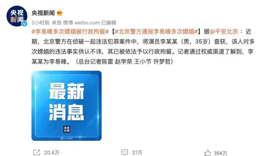 9月11日下午,北京警方发布通报称,演员李易峰因多次嫖娼被行政拘留。