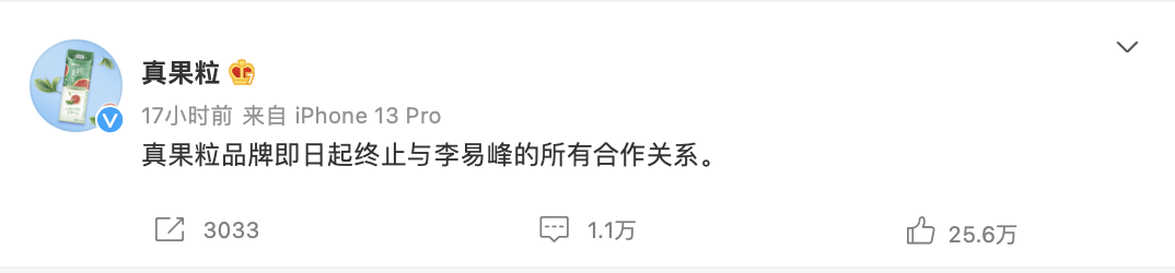 至此,李易峰代言的13家品牌全部终止了合作。曾经顶流明星,现在成了被品牌唾弃的“不道德东西”。