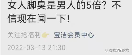2022年3月13日,宝洁旗下一个微信号“宝洁会员中心”发了条长图文,题目叫做《女人脚臭是男人的5倍,不信闻一下!》。文章指出,女人脚部及头发等都比男人的脏臭,还拿出了具体数据做对比。10天之后,此事被翻出来,被质疑“侮辱女性”。