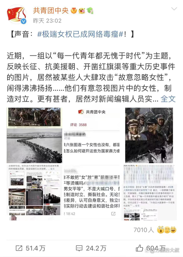 2、除了上述企业,其实官方机构也差点被围,比如共青团中央的官方微博。在其发布“极端女权已成网络毒瘤”的一条微博下面,有近60万转评和30万评论,几乎都在骂它,以至于@共青团中央 关闭了评论。虽然此事也是事出有因,但足以可见女性群体这股力量之大。