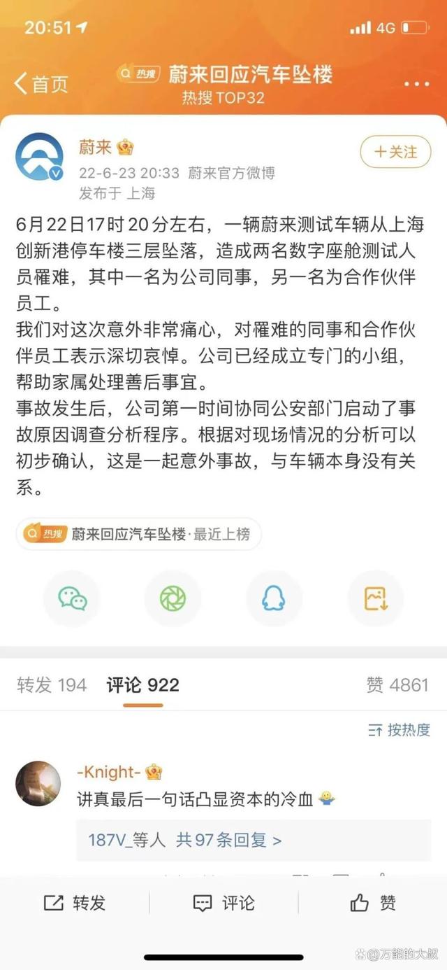 蔚来官方声明中一句 " 这是一起意外事故,与车辆本身没有关系 ",被网友认为冷血。