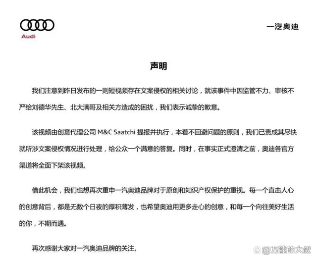 5月23日,奥迪在上午10点左右,先是撤下了官方视频号的内容,并在10点13分在官方微博发出声明。道歉+下线+甩锅(给4A公司),基本符合大叔的预判。