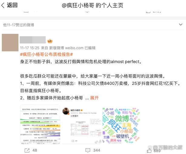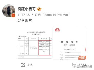 15日,涉事产品的生产公司则发布声明称,公司的产品均符合国家强制3C认证,为合格产品,不存在虚假宣传。疯狂小杨哥于11月15日在微博转发了商家声明。