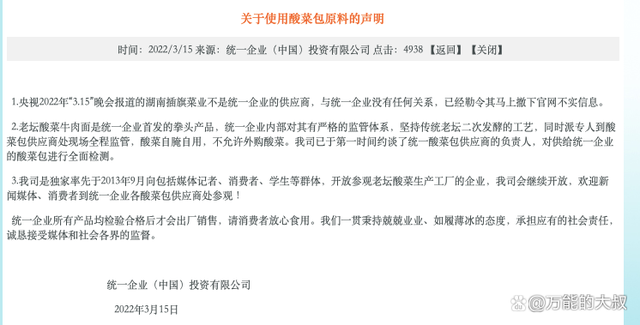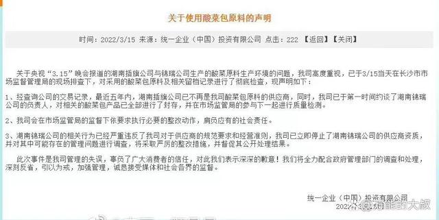 其中,统一是最早公开回应此事的,却是表现最糟糕的。因为,统一把315当晚发布的声明,竟然从官网撤下,隔了一段时间后,又发了一个新的声明。