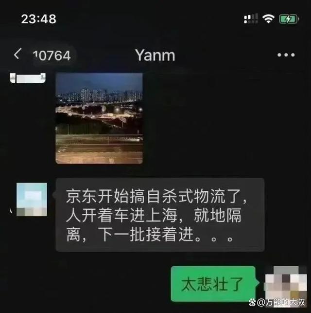 4月12日和15日,两张截图开始刷屏,均提及“自杀式物流”。 两个人的微信对话框,“京东开始搞自杀式物流了……14批人开车进上海就地隔离……太悲壮了。”截屏里的图片放大看,是一辆辆京东运输车在高架行驶。
