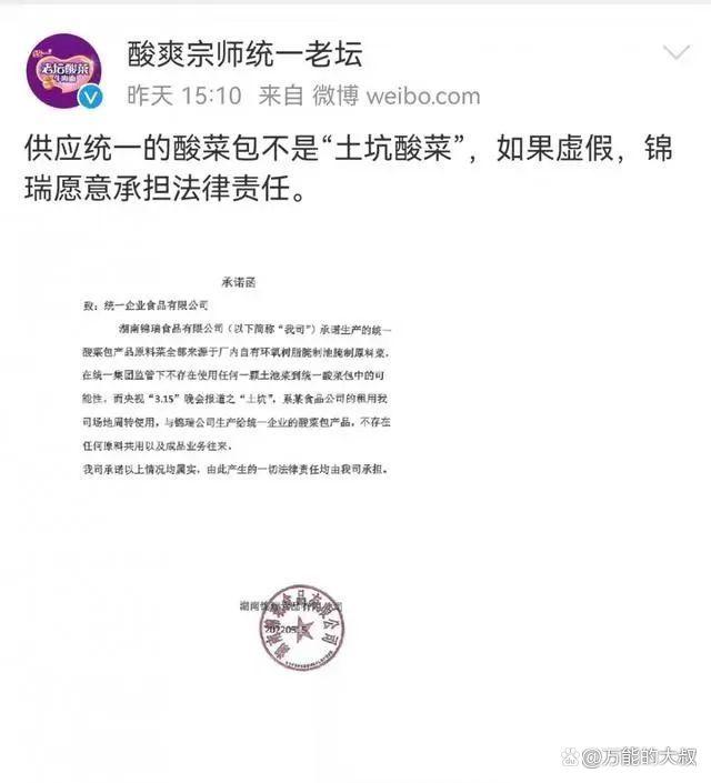 3月16日,@酸爽宗师统一老坛 官方微博发了两条声明。一条微博是贴出来“锦瑞食品”(划重点,请记住这个公司)的“致统一企业食品有限公司”的承诺书。