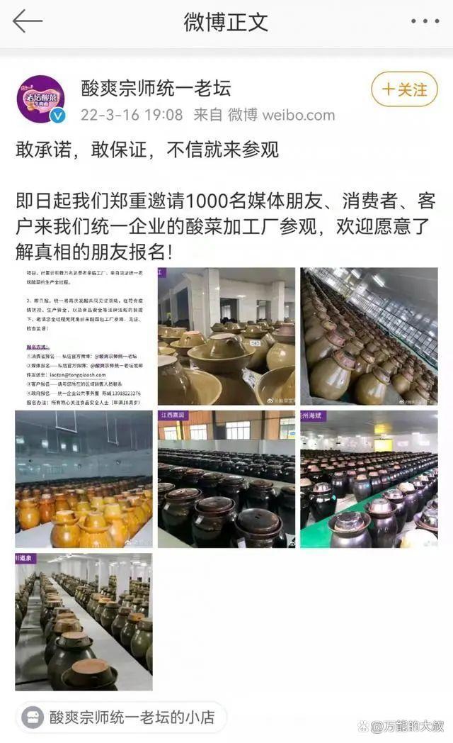 另一条官方微博,则是统一企业要主动邀请1000名媒体朋友、消费者、客户,去统一企业的酸菜加工厂参观,欢迎大家报名!